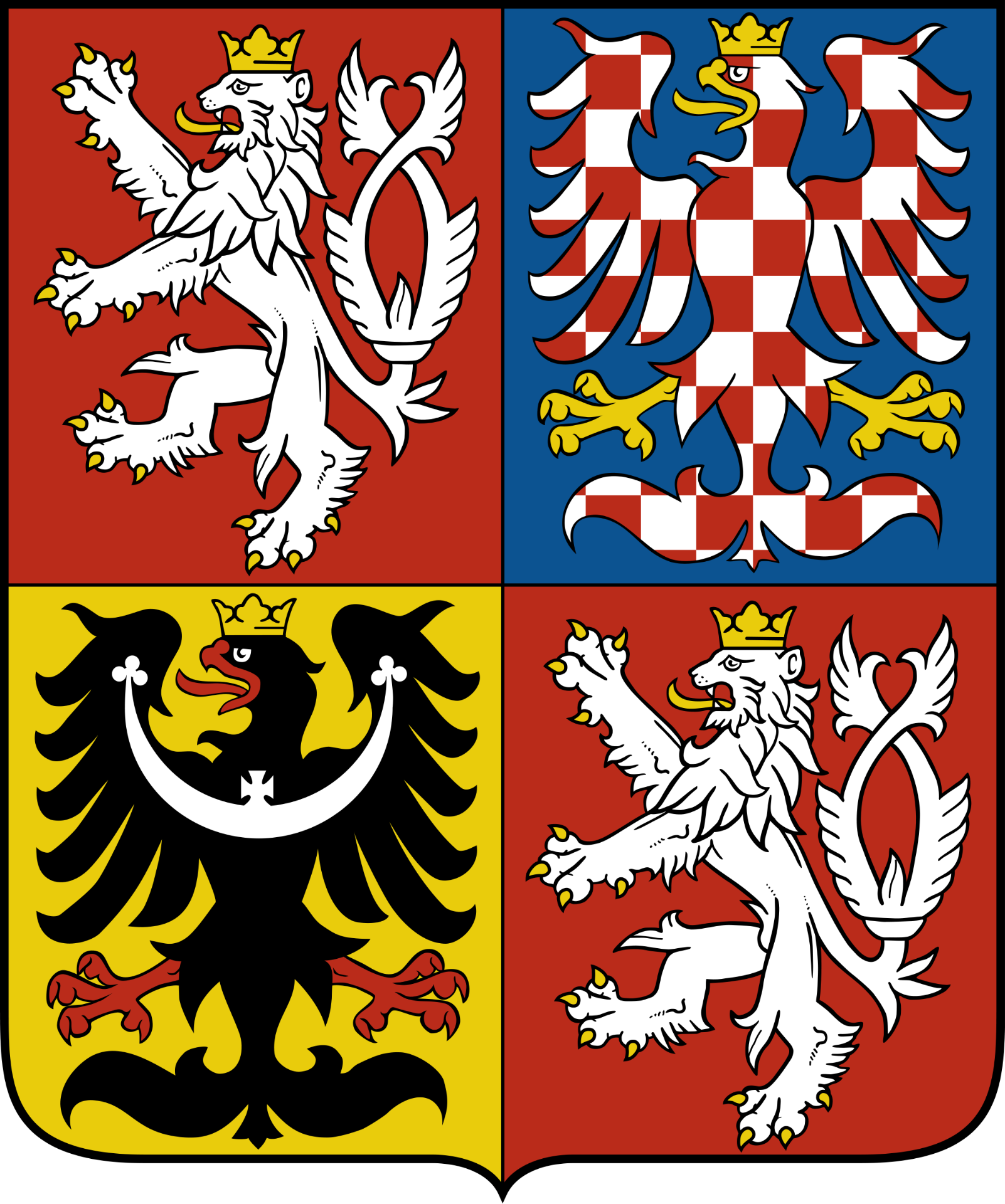 Coat of arms has 4 parts, Each of them represents one part of Czech republic. In the first and the fourth represented Bohemia - two-tailed silver lion with a golden crown on a red field. In the second, represented Moravia - eagle silver-red checkered with a golden crown on a blue field. In the third field is the emblem of Silesia - a black eagle with a golden crown and red arms on a gold background. The author is George Louda. We can find it in buildings occupied by state authorities, government agencies, etc.